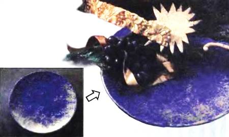 Позолоченную тарелку покройте матовым или блестящим мебельным лаком — он предохранит поталь от окисления и придаст изделию завершенный вид. Не правда ли — красиво получилось? Черный фон тарелки, просвечивающий через тончайшее золото, создает эффект черненого металла. Не забудьте заодно и слегка позолотить маленькую кедровую шишку — она очень украсит вашу композицию.