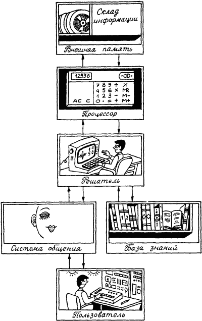 Как известно, ЭВМ пятого поколения отличаются от машин предыдущих поколений тем, что в них встроены функции программиста. По словесному заданию задачи, сформулированному на ограниченном профессиональном языке, эти ЭВМ способны сами построить необходимую рабочую программу (синтезировать ее из отдельных модулей, хранящихся в памяти ЭВМ) и выполнить ее. Для этого в состав ЭВМ должна входить база знаний, в которой хранится информация о закономерностях, присущих данной проблемной области, и методах решения характерных для нее задач. Кроме того, в состав ЭВМ должен входить специальный блок – решатель, в который встроены процедуры, подобные логическому выводу. С помощью решателя на основании сведений из базы знаний автоматически синтезируются нужные для пользователя программы. На рис. 29 приведена общая структура ЭВМ пятого поколения. Отметим, что процессор, показанный на рисунке, – это обычное арифметическое устройство с необходимой оперативной памятью, а внешняя память служит для хранения данных, нужных для решения задач. Таким образом, база знаний является новым специфическим блоком (как и система общения и решатель) в структуре ЭВМ пятого поколения.