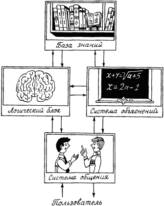 Экспертные системы, структура которых показана на рис. 31, также содержат базу знаний и логический блок, функции которого похожи на функции решателя и планировщика. Задача логического блока состоит в поиске вывода, ответа на входное сообщение, поступившее в систему. В базе знаний хранится необходимая информация о проблемной области, в которой работает пользователь. Его запросы поступают на профессиональном ограниченном естественном языке. В системе общения они преобразуются во внутреннее представление, с которым работает логический блок. Это внутреннее представление преобразуется в запрос к базе знаний. Если прямого ответа на запрос в базе нет, то логический блок осуществляет поиск косвенной информации, получаемой из хранящейся в базе с помощью достоверного или правдоподобного вывода. Система объяснения (это специфический блок, отличающий экспертные системы от других интеллектуальных систем) при необходимости по требованию пользователя поясняет ему, как получена та информация, которая выдана в качестве ответа.
