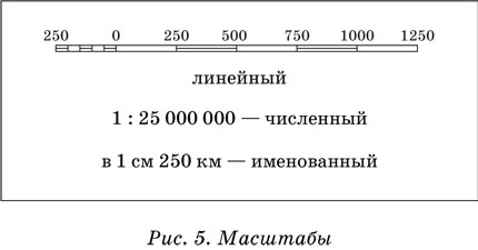 Масштабом называется отношение длины линии на чертеже, плане или карте к длине соответствующей линии в действительности. Масштаб показывает, во сколько раз расстояние на карте уменьшено относительно реального расстояния на местности. Если, например, масштаб географической карты 1 : 1 000 000, это значит, что 1 см на карте соответствует 1 000 000 см на местности, или 10 км. Различают численный, линейный и именованный масштабы.
