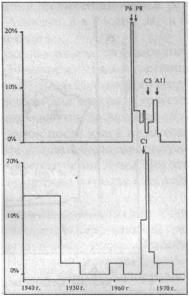 Аналогичная вспышка активности была и в кратере Гассенди, вклад которого в статистику лунных аномалий подскочил в 8 раз сразу после посадки ближайшего к кратеру аппарата — «Сервейора-1» (рис. 11). А вот многочисленные вторжения землян в Море Дождей, Море Изобилия, Море Ясности, Океан Бурь не сопровождались заметным повышением активности в окрестностях мест посадок. Исследование Моря Дождей в 1959–1971 гг. даже совпало с временным затуханием активности расположенной там горы Пико в 1956–1974 гг. Все это позволяет отбросить версию повышенного внимания наблюдателей к местам прилунений.