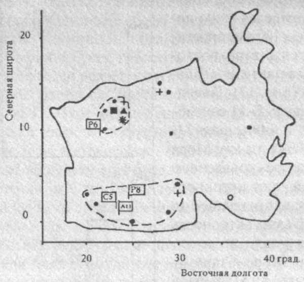 Рис. 12. Концентрация кратковременных лунных феноменов в местах посадок космических станций в Море Спокойствия (обозначения те же, что и на рис. 11).