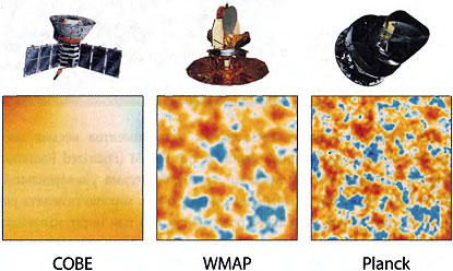 Рис. 36.1. Прогресс в разрешении космических микроволновых телескопов. Один и тот же участок неба, снятый COBE.WMAP и «Планком»