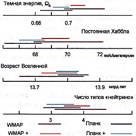 Несколько увеличилась доля темной материи и уменьшилась доля темной энергии, однако разница лишь немного выходит за одно стандартное отклонение. Предел на примесь реликтовых гравитационных волн остался примерно тем же, что и по данным WMAP. Оценка возраста Вселенной чуть увеличилась (до 13,8 млрд лет). Сравнение значений важных космологические параметров по данным WMAP и «Планк» дано на рис. 36.2. Значения с ошибками даны в двух вариантах: если брать только данные миссии и если дополнить их данными других наблюдений, в том числе, касающихся современной Вселенной: они обозначены как WMAP+ и «Планк»+. Существенно для физиков то, что подтверждена оценка эффективного числа типов «нейтрино» — она тяготеет к трем, которые уже известны. Искать четвертую легкую слабо взаимодействующую частицу вроде бы нет резона. Почти вдвое уменьшен верхний предел на сумму масс трех типов нейтрино: если привлечь все силы, то натягивается предел 0,24 эВ. Хорошо и важно, что «Планк» подтверждает результат WMAP по наклону спектра первичных возмущений плотности Вселенной. Показатель наклона спектра n = 0,96 отличается от плоского на 0,04 как по данным WMAP+, так и по результатам «Планк»+, но «Планк» поднял статистическую значимость этого отклонения до 6 сигма. Верхний редел на вклад реликтовых гравитационных волн немного снизился, до r < 0,11. Радикально снижен предел на негауссовость флуктуаций реликтового излучения. Свойство гауссовости означает, что карта излучения является случайной суммой независимых флуктуаций и выражается в том, что фазы угловых мультиполей не коррелируют друг с другом. Возможно, это самый важный результат на настоящий момент. О значении нового предела говорится ниже в интервью с Андреем Линде.
