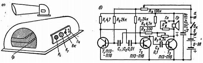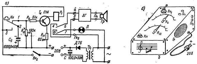 Сейчас на радиостудиях, в театрах, на стадионах применяются специальные электрозвуковые устройства, они служат для передачи позывных сигналов, сигналов-гонгов, воспроизведения боя часов и в других случаях. Устройства эти по своей конструкции (рис. 26, а) могут быть электронными и с электромеханическим механизмом. Датчиком для акустических сигналов может служить звуковой генератор, собранный по схеме симметричного мультивибратора на двух низкочастотных транзисторах одинаковой проводимости Т1 и Т2 типа П13—П16 (рис. 26, б). Для увеличения силы звукового сигнала подключен дополнительный усилительный каскад, собранный на транзисторе Т3 типа П4. Звуковой сигнал воспроизводится при помощи электродинамического громкоговорителя типа 0,15 ГД-ШМ-3, включенного в коллекторную цепь транзистора Т3.