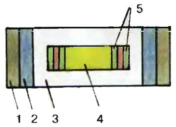 1 — резина; 2 — полипропиленовая вставка; 3 — пьезокристаллическое кольцо; 4 — источник света; 5 — электрическая схема.