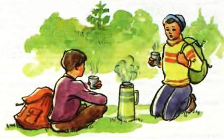 Какие только усовершенствования термоса не предлагали наши читатели! И вот еще одно. Евгений Пискун из Краснодара предложил термос с автономным электрообогревом от батареек. Нагревательный элемент — две металлические полоски, опущенные в содержимое.