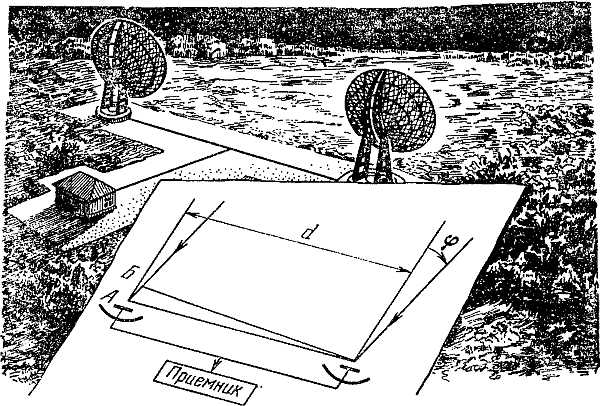 Рис. 40. Схема радиоинтерферометра (d — его база, т. е. расстояние между радиотелескопами, угол характеризует направление на источник радиоволн).