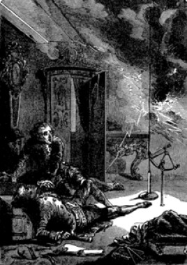 Вскоре после того как г. профессор, отстоя на фут от железного прута, смотрел на указатель электрической силы, увидел помянутый Соколов, что из прута без всякого прикосновения вышел бледно-синеватый огненный клуб, с кулак величиною, шел прямо ко лбу г. профессора, который в то самое время, не издав ни малого голосу, упал назад, на стоящий позади его у стены сундук. В самый же тот момент последовал такой удар, будто бы из малой пушки выпалено было, отчего и оный грыдоровальный мастер упал на землю и почувствовал на спине у себя некоторые удары, о которых после усмотрено, что оные произошли от изорванной проволоки, которая у него на кафтане с плеч до фалд оставила знатные горелые полосы.