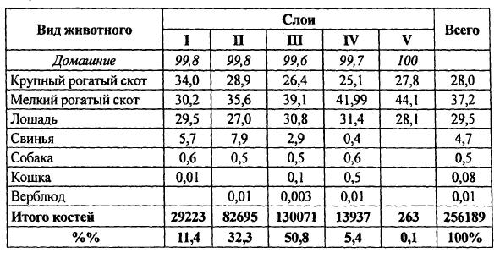 Таблица 6. Распределение остатков домашних животных из раскопок Казанского кремля по слоям (%%).