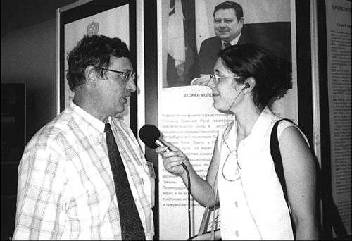 А. И. Веретин дает интервью корреспонденту радио «Гардарика» Елене Ковтуненко на выставке, посвященной 2500-летию Старой Ладоги (на фоне портрета губернатора Ленобласти В. П. Сердюкова), 2003 г.