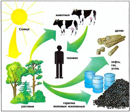 Солнечная энергия помогает росту растений. А человек и животные существуют благодаря растениям, выращенным Солнцем. Его энергия идет также на преобразование растений в горючие полезные ископаемые: нефть и уголь.