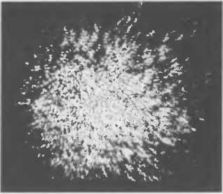 Рис. 3.35. Мгновенное изображение яркой звезды, Веги, полученное французским астрономом А. Лабейри на 5–метровом Паломарском телескопе при атмосферном качестве изображений 1,5". Именно такой угловой диаметр имеет вся эта «клякса» на фото, но состоит она из множества мелких частей — спеклов, каждый размером около 0,02". Спеклы — это результат интерференции света, прошедшего через объектив телескопа и получившего случайные фазовые задержки при прохождении через атмосферу.