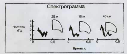 Прекрасным примером коммуникации, не связанной с человеком, может служить пение некоторых птиц, таких, как попугаи и некоторые родственные им виды. Обычно эти птицы живут в чаще леса, где визуальный контакт сильно ограничен или вообще отсутствует. В этих условиях спаривающиеся особи находят друг друга и координируют свое поведение, исполняя общую песнь. Например, на рис. 58 вы видите спектрограмму двух африканских птиц. рис. 58. Вокальный дуэт африканских птиц.