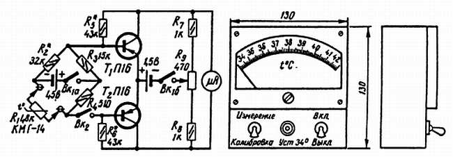 При налаживании для получения пределов измерения температуры от 34 до 42 °C используется подбор сопротивления резистора R2 для сдвига всего диапазона и сопротивлений резисторов R5, R6 для расширения или сужения границ диапазона. Питание термометра осуществляется двумя сухими элементами 332, включение которых производится одним двухполюсным тумблером ВК1. Установка стрелки прибора на начальное деление шкалы производится переменным резистором R9 при разомкнутом выключателе ВК2. Точность измерения температуры не превышает ±0,05 °C, время, достаточное для измерения, — не более 5 с. Вместо транзисторов П16 можно использовать КТ361 с любым буквенным индексом.