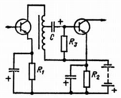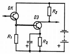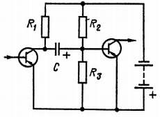 На схеме видно, что R1 служит нагрузочным резистором первого транзистора. Переменное напряжение, создаваемое на этом резисторе коллекторным током, через конденсатор С передастся на базу второго транзистора; смещение на базу подается с делителя напряжения R2, R3.