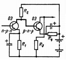 Рис. 153. Непосредственная связь между двумя транзисторами противоположных типов: n-р-n и р-n-р.