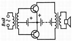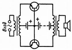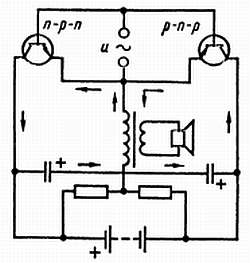 На рисунке, который ты видишь, транзисторы типов n-р-n и р-n-р включены по схеме с ОЭ. Когда во время одного из полупериодов обе базы положительны, ток коллектора транзистора типа n-р-n увеличивается и протекает снизу вверх (по схеме) по первичной обмотке выходного трансформатора. При следующем полупериоде, когда базы становятся отрицательными, ток коллектора транзистора типа р-n-р становится больше и протекает по первичной обмотке трансформатора на этот раз в противоположном направлении: сверху вниз (по схеме). Как видишь, здесь даже нет необходимости иметь средний отвод в первичной обмотке.