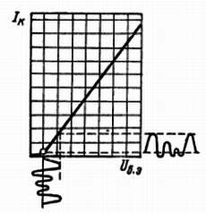 Рис. 156. Работа транзистора в режиме В. Кривая показывает величину тока в зависимости от напряжения база — эмиттер.