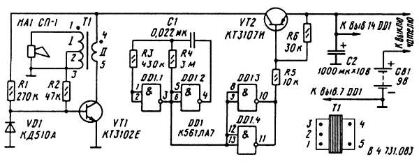 Для получения звукового сигнала тревоги электрические колебания генератора модулируются манипулятором, который содержит транзистор VT2 и микросхему DDL На элементах DDL1 и DD1.2 собран генератор релаксационных колебаний, частота повторения которых составляет 5–6 Гц и определяется сопротивлением резистора R4 и емкостью конденсатора С1. Элементы DD1.3 и DD1.4 образуют буферный каскад.
