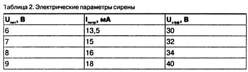 Питание сирены производится от батареи «Крона» или «Корунд» напряжением 9 В. Несмотря на высокий уровень громкости, создаваемый пьезоэлементом, потребление энергии от батареи невелико. В табл. 2 приводятся значения потребляемого устройством тока Iпотр и эффективного значения напряжения Uэфф на излучателе от напряжения питания.