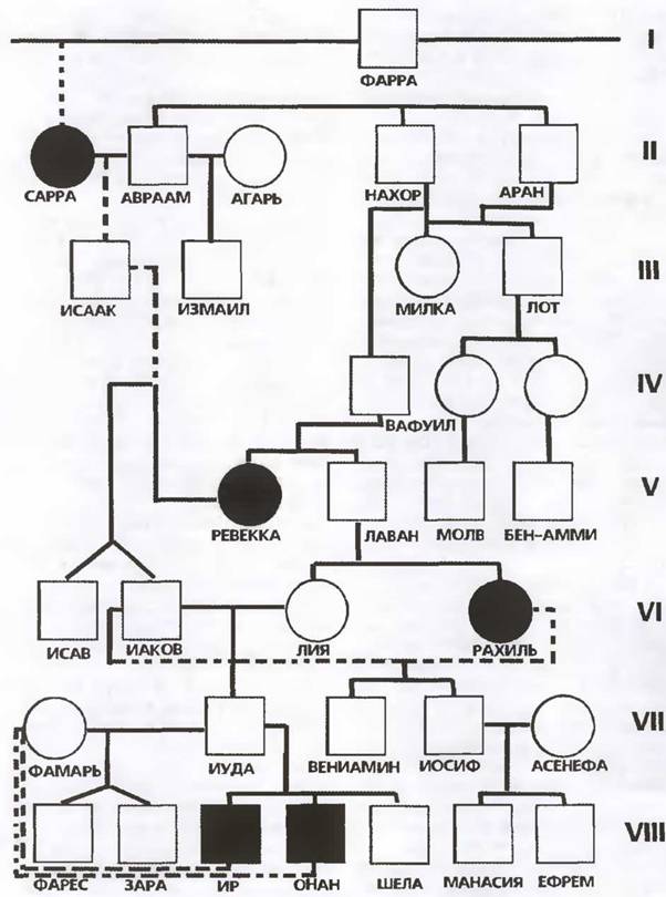 ФРАГМЕНТ РОДОСЛОВНОЙ БИБЛЕЙСКИХ ГЕРОЕВ ЖЕНЩИНЫ ОБОЗНАЧЕНЫ КРУЖКАМИ, МУЖЧИНЫ – КВАДРАТАМИ; ЛИНИИ, ИСХОДЯЩИЕ ИЗ КРУЖКА ИЛИ КВАДРАТА, ПОКАЗЫВАЮТ ДАННЫЙ БРАК. ПОТОМСТВО ЭТОГО БРАКА УКАЗАНО ПО НИСХОДЯЩЕЙ ВЕРТИКАЛЬНОМ ЛИНИИ. СПРАВА УКАЗАНО ЧИСЛО ПОКОЛЕНИЙ; ЧЛЕНЫ РОДОСЛОВНОЙ, СТРАДАВШИЕ ОТ БЕСПЛОДИЯ, ОТМЕЧЕНЫ ЧЕРНЫМ ЦВЕТОМ И ДАННАЯ ЛИНИЯ БРАКА ОТМЕЧЕНА ПУНКТИРНОЙ ЛИНИЕЙ. БЛИЗНЕЦЫ УКАЗАНЫ РАЗДВОЕННОЙ ЛИНИЕЙ. НА РОДОСЛОВНОЙ ХОРОШО ВИДНЫ ДВА ЭЛЕМЕНТА СТРУКТУРЫ СКРЕЩИВАНИЯ В ДРЕВНИХ БИБЛЕЙСКИХ ПОПУЛЯЦИЯХ: БЛИЗКОРОДСТВЕННЫЕ БРАКИ И ПОЛИГАМИЯ.