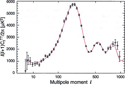 Высокий пик слева означает, что карта имеет самую контрастную пятнистость при размере пятна около градуса. Он соответствует акустическим волнам, пришедшим к моменту рекомбинации с фазой ?. За одно колебание они успели подрасти из-за гравитационного взаимодействия с темной материей, которая за это время «скомковалась» в сто раз сильней барионного вещества. Правее — следующие пики, соответствующие фазам 2?, 3? и т.д. Пики при увеличении номера мультиполя (уменьшении размеров неоднородностей) становятся ниже, потому что оказываются «замытыми» из-за диффузии фотонов, которые успевают частично разбежаться из сгущения вещества за период колебания стоячей волны. Это так называемый эффект Силка. Особенно хорошо этот эффект наблюдается на рис. 32.2, где тот же самый спектр мощности дан в логарифмическом масштабе и к нему добавлены данные наземных установок с меньшим охватом неба, но с лучшим угловым разрешением.