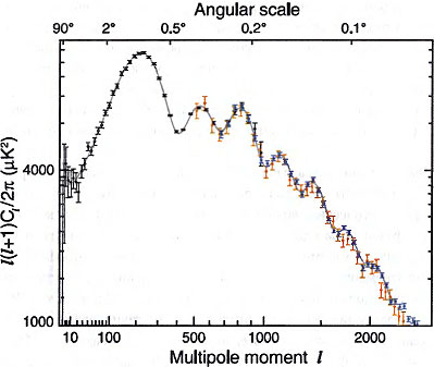 Черные точки с ошибками (те же, что и на рис. 32.1) — результат WMAP. Голубые точки — результат обзора небольшой части неба, сделанного с лучшим угловым разрешением с помощью микроволнового телескопа на Южном полюсе (SPT). Оранжевые точки — данные Космологического телескопа в Атакаме (ACT). Сплошная кривая — результат подгонки теории только к данным WMAP, данные при муль-типольных моментах больше тысячи не использовались!