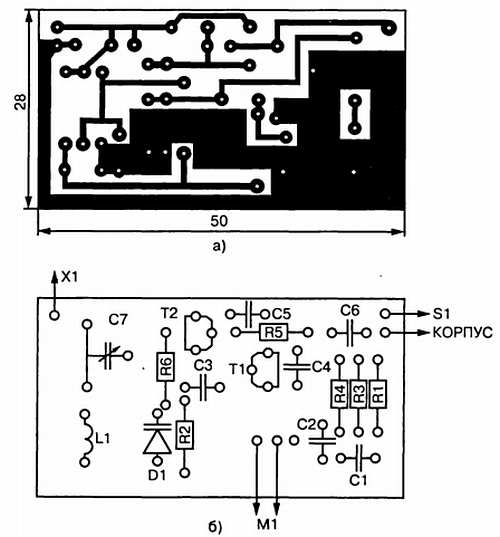 Рис. 7. Печатная плата (а) и расположение элементов (б) простого радиомикрофона