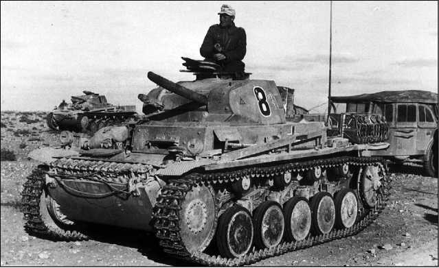 В марте 1941 года в 5-м танковом полку 5-й легкой дивизии германского Африканского корпуса, высадившейся в Триполи, имелось 45 Pz.II, главным образом модели С. К ноябрю 1941 года, после прибытия 15-й танковой дивизии, число «двоек» на Африканском континенте достигло 70 единиц. В начале 1942 года сюда доставили еще одну партию Pz.II Ausf.F(Tp) — в тропическом исполнении. Переброску этих машин в Африку можно объяснить, пожалуй, только их малыми массой и габаритами по сравнению со средними танками. Немцы не могли не отдавать себе отчета в том, что против большинства танков 8-й английской армии «двойки» были бессильны и лишь высокая скорость помогала им выходить из- под обстрела противника. Впрочем, несмотря ни на что, Pz.II Ausf.F использовались здесь вплоть до 1943 года.