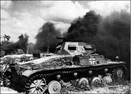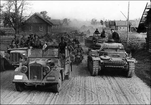 Вверху: горящий танк Pz.II из состава 7-й танковой дивизии, подбитый под Алитусом. Июнь 1941 года. Внизу: колонна боевой техники 3-й танковой дивизии Вермахта на дороге в районе Пружан. Июнь 1941 года. На переднем плане полноприводный автомобиль «Хорьх 901» и танк Pz.II Ausf.C.
