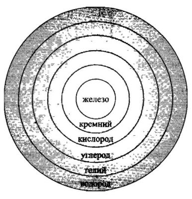 Рис. 12. На этой диаграмме приводится схематическое строение звезды большой массы на поздней стадии ее эволюции — всего за несколько минут до вспышки сверхновой. Каждый «луковичный слой» представляет слой продуктов ядерного горения вокруг центрального инертного железного ядра. Здесь показана только центральная область звезды; остальная ее часть состоит из толстой оболочки, образованной несгоревшим водородом