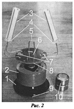 Его основа — электродвигатель 2 с номинальным напряжением питания около 6 В (от компьютерного DVD-привода). На валу двигателя закреплен диск подставка 1 диаметром 27 мм, (также от DVD-привода). К нижней масти подставки приклеены несколько резиновых амортизаторов 9, изготовленных из пассика от магнитофона. Остальные детали смонтированы на печатной плате 8. На светодиоды 4 надеты отрезки 3 пластиковой трубки. Из металлических канцелярских скрепок изготовлены держатели 5 (ХТ1) и 6 (ХТ2) гальванических элементов, а также контакты 7, которые припаивают к плате и выводам двигателя.