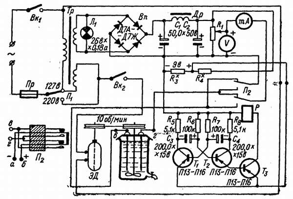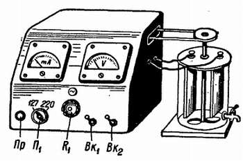 Переменный резистор R1 установлен на выходе фильтра и позволяет регулировать величину тока (согласно таблице, о которой будет рассказано позже). Контроль за изменением тока и напряжением ведется по показания измерительных приборов. Далее ток подводится к переключателю полярности Яг и к серебряным пластинкам, опущенным в сосуд с водой. Лампа Л1 служит индикатором включения прибора, а выключатель Вк2 — для включения электродвигателя.