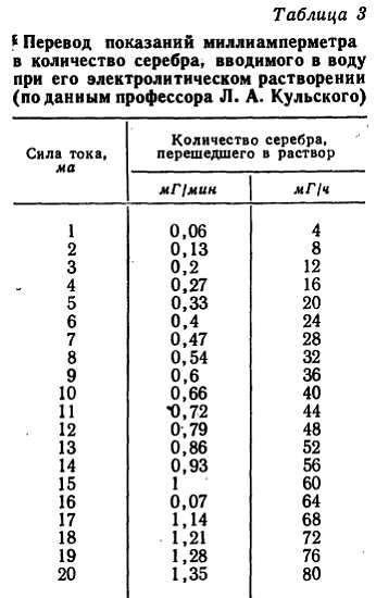 Как пользоваться таблицей? Например, необходимо ввести в литр воды 20 мГ серебра. Для этого устанавливаем силу тока 15 ма. По таблице при 15 ма в воду переходит 1 мГ/мин серебра — время электролиза 20 мин. То же количество серебра можно ввести и в другом режиме: сила тока 5 ма, время электролиза 1 ч. Полученную серебряную воду можно хранить в темном прохладном помещении в стеклянном закрытом сосуде с притёртой стеклянной пробкой. Пользоваться серебряной водой можно соответственно с табл. 4.