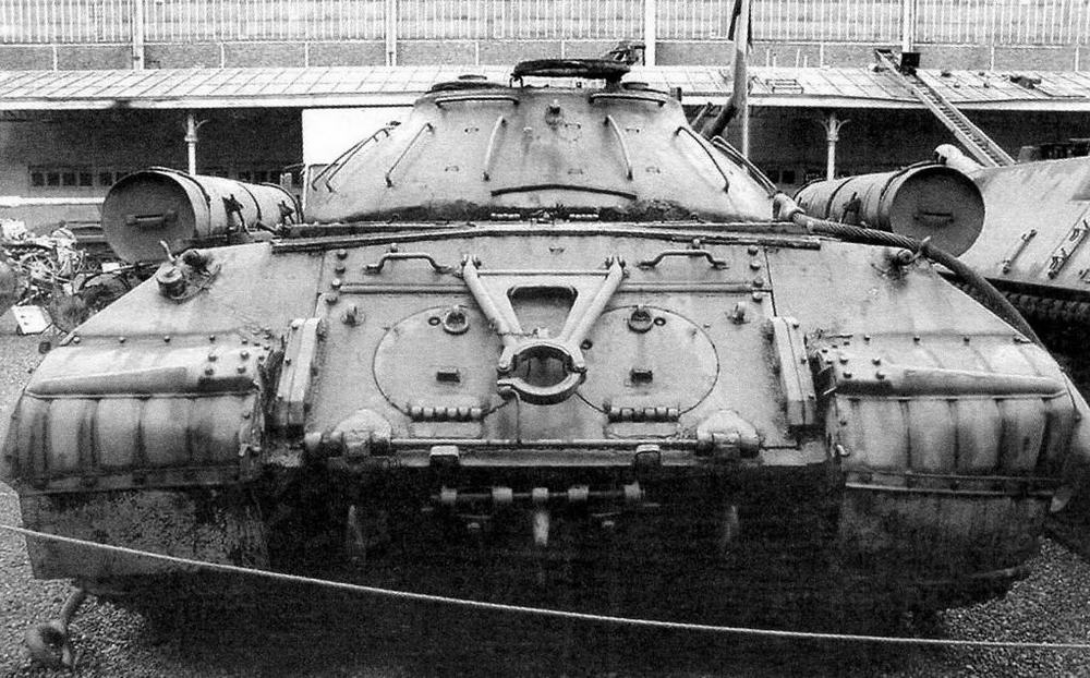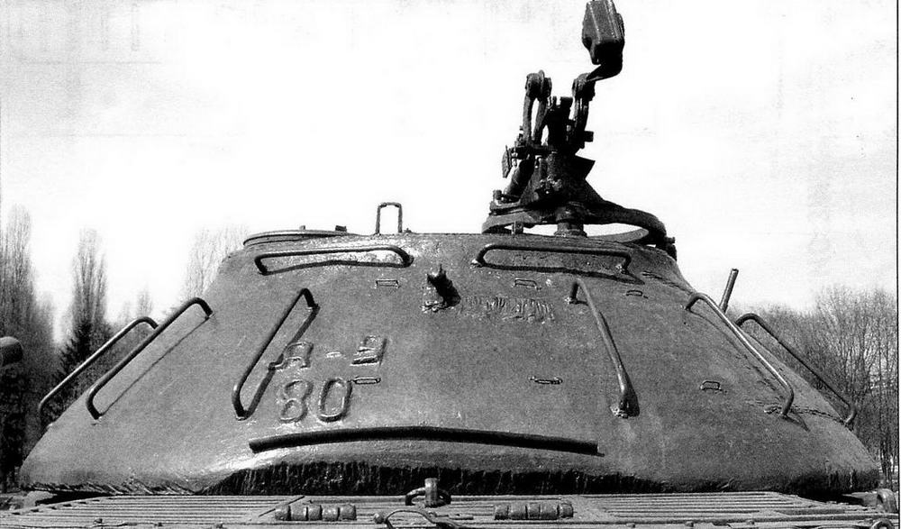 Башня танка ИС-ЗМ. На правом крыле— масляный бачок, за ним видны крышки бортовых бункеров. Под маской орудия—треугольный люк механика-водителя