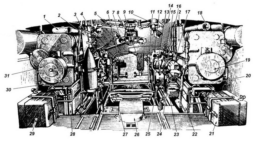 1—укладка для автомата АК; 2—укладки для гранат Ф-1; 3—фильтр грубой очистки топлива; 4—тахометр; 5—люк механика-водителя: 6—педаль главного торсиона; 7—щиток водителя; 8—прибор наблюдения водителя; 9—педаль подачи топлива; 10—закрывающий механизм крышки люка; 11 — рычаг управления; 12—манометр воздушного запуска двигателя; 13—рычаг переключения передач; 14—спидометр; 15—счётчик моточасов; 16—баллон системы воздухопуска; 17—сливной бачок; 18—досылатель; 19, 31—магазины к пулемёту ДТ; 20, 30—дверки правой и левой укладок на семь гильз; 21, 29—магазинные коробки к ДШК; 22, 28—аккумуляторные батареи; 23—блок питания прибора наблюдения; 24—выключатель батарей; 25—ручной рычаг подачи топлива; 26—укладка замковой втулки прибора наблюдения; 27—сиденье механика-водителя