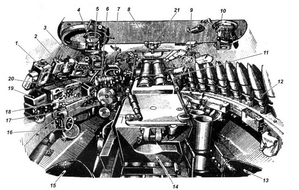 1 —аппаратура ТПУА-1 командира; 2—блок настройки антенны; 3—электрощиток башни; 4—танковый перископ командира (ТПК); 5—аппарат ТПУ А-2 наводчика; 6—электродвигатель механизма поворота башни; 1—прицел TLU-17; 8—внутренний стопор пушки «по-походному»; 9—аппарат ТПУА-3 заряжающего; 10—прибор наблюдения заряжающего МК-4; 11 — спаренный с пушкой пулемёт ДТ; 12—лотковая снарядная укладка; 13—сиденье заряжающего; 14—пушка Д-25Т; 15—сиденье командира; 16—стопор башни; 17—маховичок ручного привода механизма поворота башни; 18—контроллер; 19—блок питания радиостанции и ТПУ; 20—радиостанция Р-113; 21 —разгрузочная тяга