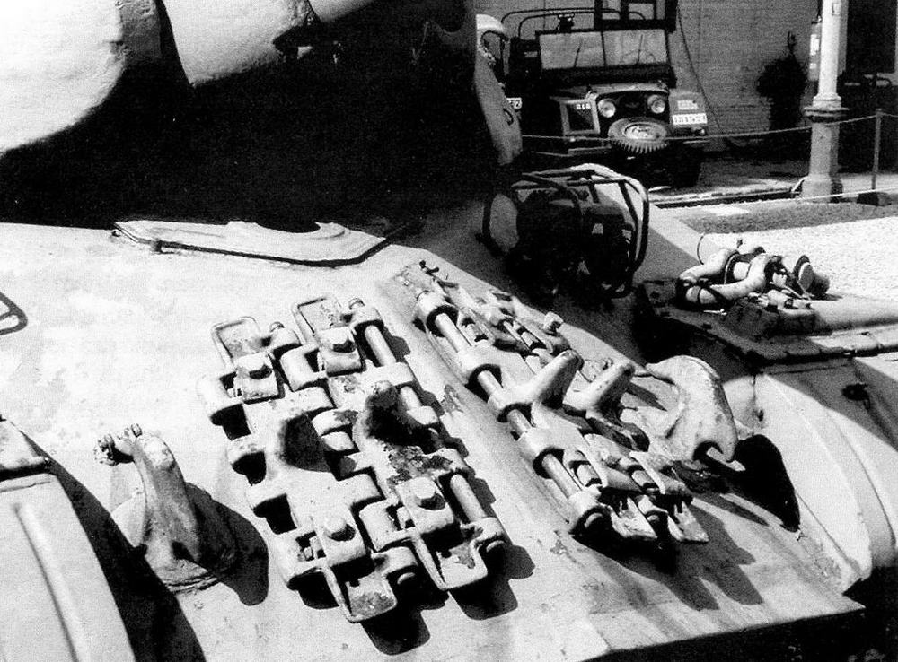 ХОДОВАЯ ЧАСТЬ: шесть пар сдвоенных опорных катков, независимая торсионная подвеска, три пары поддерживающих катков, направляющие колёса спереди, ведущие колёса кормовые; гусеницы металлические, одношкворневые, одногребневые, 86 траков (минимально допустимо — 79), ширина — 650 мм, шаг — 160 мм, опорная длина гусеницы — 4300 мм, масса одной гусеничной цепи — 2000 кг.