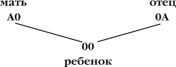 Если ребенок получает по гену а от каждого из родителей («АА»), то у него, разумеется, будет группа крови А, как и раньше. Но сейчас может случиться и так, что от одного родителя он получит ген, производящий антитела А, а от другого ничего не производящий ген — сочетание «А0» (А плюс 0). Поскольку анализ крови будет давать положительную реакцию на антиген А, то его кровь также принадлежит к группе А. Таким образом, мы имеем два сочетания для одной и той же группы крови А (а если считать гены отца и матери разными, то даже три — АА, 0А и А0). То же относится и к группе крови В. Кроме этого, ребенку по-прежнему могут достаться два разных варианта гена, А и В. В таком случае у него будет группа крови АВ. Наконец, и от отца, и от матери ему могут достаться гены, не производящие ничего, то есть гены 0. В результате у него будет группа крови 0 («00»). Получается, что единственный способ получить группу 0 — это получить по нулевому гену от отца и матери, но, несмотря на это, такая группа самая распространенная. А все потому, что большинство родителей с группой крови А имеют гены «А0» или «0А», а не «АА». Также и большинство людей с группой крови В имеют гены «В0» или «0В», а не «ВВ». Если добавить к ним людей с генами «00», то получается, что носителей гена «0», не производящего никаких антигенов, большинство.