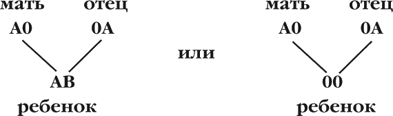 В последнем примере у ребенка могла быть также группа А («А0») или группа В («0В»), но не «АА» и не «ВВ». Какой из вариантов окажется в действительности — исключительно дело случая. Это зависит от того, какой из генов матери, «А» или «0», окажется в яйцеклетке при оплодотворении, а также от того, какой из генов отца, «В» или «0», окажется в оплодотворившем яйцеклетку сперматозоиде (в яйцеклетке или сперме остается только одна хромосома из парных). Если у таких родителей несколько детей, то группы крови у них могут отличаться.
