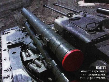 Мощность ее вооружения сокрушительна: тут тебе и две пушки, и четыре пусковые установки противотанковых ракет, и пулеметы, и автоматические гранатометы. БМПТ за минуту может выстрелить девятьсот 30-миллиметровых снарядов, шестьсот 30-миллиметровых гранат и две тысячи 7,62-миллиметровых пуль. Причем боезапаса достаточно, чтобы уничтожить противника на площади в 3 кв. км.