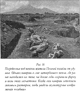 В одном месте смерть настигла семерых детей, игравших, ничего не подозревая, в комнате. В другом — тридцать четыре человека и с ними козу, которая, очевидно, пыталась, отчаянно звеня своим колокольчиком, найти спасение в мнимой прочности людского жилища. Тому, кто слишком медлил с бегством, не могли помочь ни мужество, ни осмотрительность, ни сила. Был найден скелет человека поистине геркулесового сложения; он тоже оказался не в силах защитить жену и четырнадцатилетнюю дочь, которые бежали впереди него; все трое так и остались лежать на дороге. Правда, в последнем усилии мужчина, очевидно сделал еще одну попытку подняться, но, одурманенный ядовитыми парами, медленно опустился на землю, перевернулся на спину и застыл. Засыпавший его пепел как бы снял слепок с его тела; ученые залили в эту форму гипс и получили скульптурное изображение погибшего помпеянина (рис. 16).