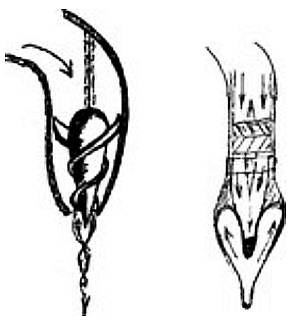 Следует сказать: непрерывное (одностороннее) вращение оказывает тормозящее действие. Вода поднимается по трубе, закрученной внутрь и вверх, по часовой стрелке. Это сопровождается выталкиванием закруженной в двойной мембране воды в яйцевидное отверстие форсунки, в которой под огромным центробежным давлением движущая вода снова центростремительно закручивается. Тогда она начинает течь на очень высокой скорости в ниже расположенную герметично изолированную барокамеру, которая; при мощном гидравлическом давлении проталкивает воду, первоначально втягивающуюся закрученной трубой по направлению к водозабору этой трубы[69].