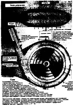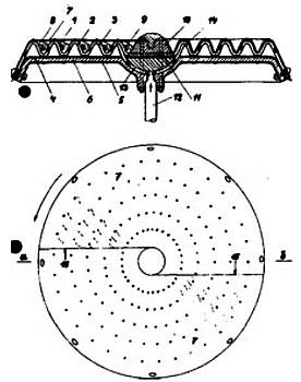 «Машина изобилия», работающая на воде, которая функционирует, используя центробежное давление, преимущественно состоит из двойной мембраны (см. план и поперечное сечение на рис. 30), которая вращается против часовой стрелки вокруг вертикальной оси при помощи маломощного двигателя.
