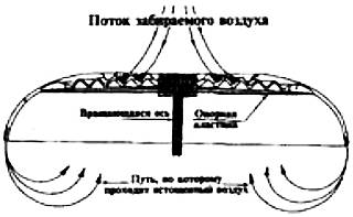 Так называемая закрученная труба завивается вокруг вертикального вала, совпадающего по расположению с этой осью. Рассматривая снизу, можно увидеть, что закруженная труба вращается по часовой стрелке и без любого сопротивления всасывает центростремительно сжатую воду двигателя.