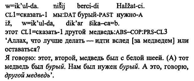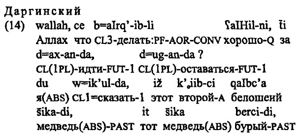В ряде даргинских примеров в строке глосс не выделены классные показатели, превербы и суффиксы глагольной основы.