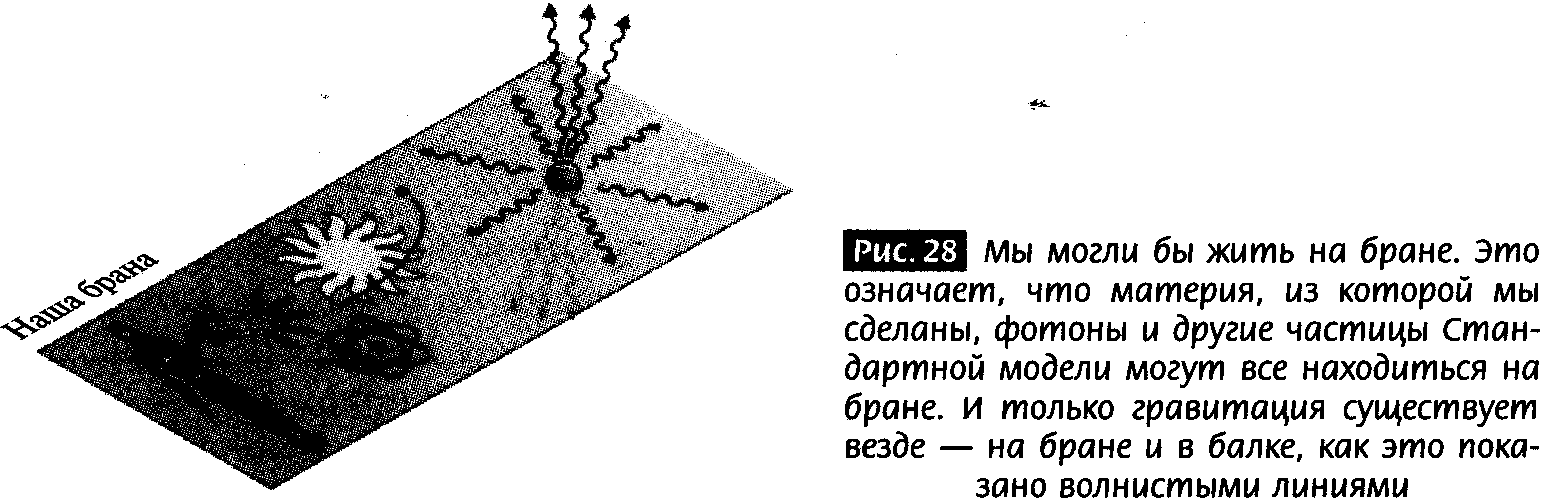Так как браны могут захватывать большинство частиц и сил, то вполне вероятно, что Вселенная, в которой мы живем, может размещаться на трехмерной бране, плавающей в море дополнительных измерений. Гравитация будет простираться и в дополнительные измерения, но звезды, планеты, люди и все прочее, что мы ощущаем, может находиться в заточении на трехмерной бране. В этом случае мы бы жили на бране. Брана могла бы быть нашей естественной средой обитания. Понятие о мире на бране основано на этом предположении (рис. 28).