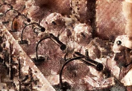 Сборочный цех часового завода. Его рабочие похожи на лаборантов и ученых.
