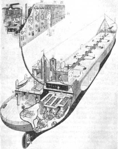 Корабль-робот «Брауншвейг». 1 — люки, через которые теплоход заполняется нефтью или другим жидким грузом; 2 — танки, т. е. баки для нефти; 3 — помещение для команды; 4 — машинное отделение; 5 — дизель мощностью в 750 лошадиных сил; 6 — динамомашина; 7 — один из вспомогательных электродвигателей; 8 — главный электродвигатель, вращающий гребной вал; 9 — муфта сцепления; 10 — рулевая машина; 11 — вспомогательный штурвал на случай аварии главного рулевого управления; 12 — вентиляционная труба; 13 — прожектор; 14 —штурманская рубка; 16 — капитанский мостик; 16 — механик, управляющий всем кораблем, у щита управления; 17 — пусковые рукоятки для дизелей; 18 — вид щита управления с задней стороны; 19 — электроизмерительные приборы (ампер- и вольтметры); 20 — секция управления главными дизелями; 21 и 22 — секция управления вспомогательными машинами; 23 — секция управления помпами; 24 — выключатели.